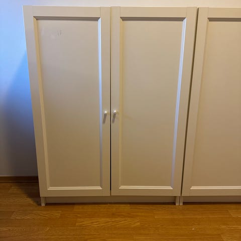 To brukte bokskap, med magnetlås inni dørene. På to av skapdørene er magnetene ødelagt. De kan imidlertid lukkes igjen likevel. Men altså behov for nye fester i dørene. Skapene står også helt stødig oppå hverandre.