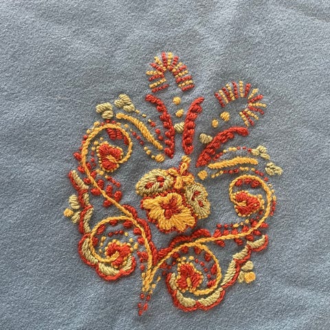 Brodert sjal med spenne og frynser . Sølv maljer på livet.