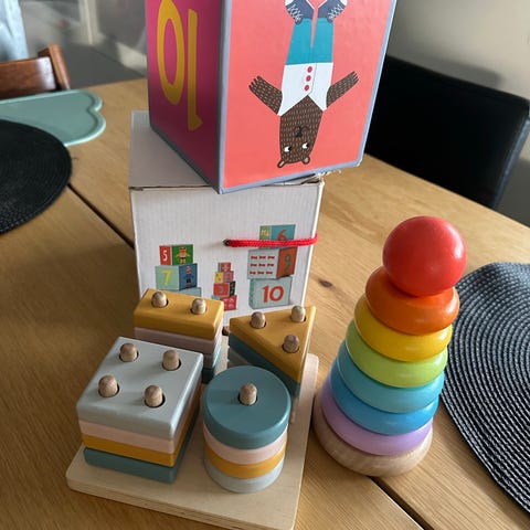Fine leker som har stått hos bestemor. Stableleke og trefigurer for å tre på en snor, selges