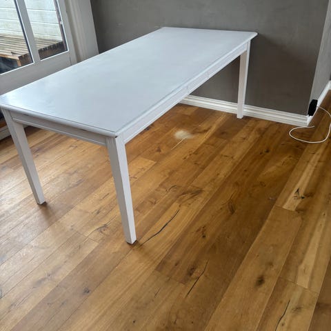 Hvitt kjøkkenbord gies bort. 80 cm bredt, 90 cm langt, 132 cm med klaffene ute. Må hentes