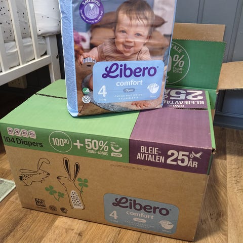 6 stk uåpnet kjølebind, 1pk lindrewipes og str 1 bleier gis bort. Er en hel pakke uåpnet bleier, samt en pose med løse bleier.