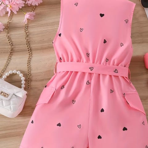 Ermeløs overdel med v-utringning og dobbelspent front. Bukse har vide, plisserte ben som gir god bevegelsesfrihet. Passer til jente i størrelse 128 og kan brukes til både hverdag og mer pyntede anledninger.