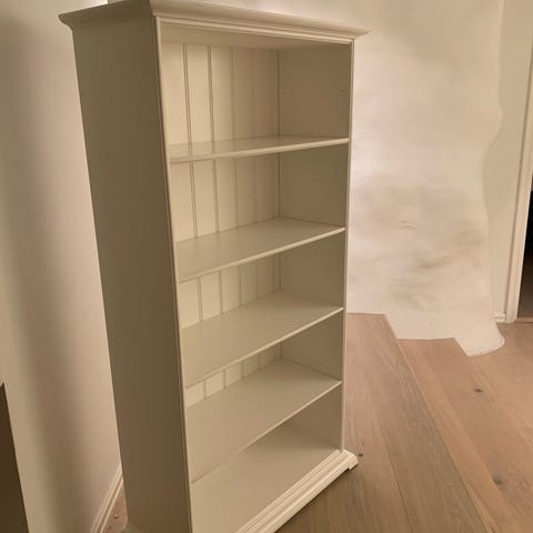 Sjarmerende hylle i klassisk stil med fine detaljer og profilerte kanter. Malt i en lys, nøytral farge som passer inn i de fleste hjem. Perfekt til oppbevaring av bøker, pynt eller kjøkkenutstyr.