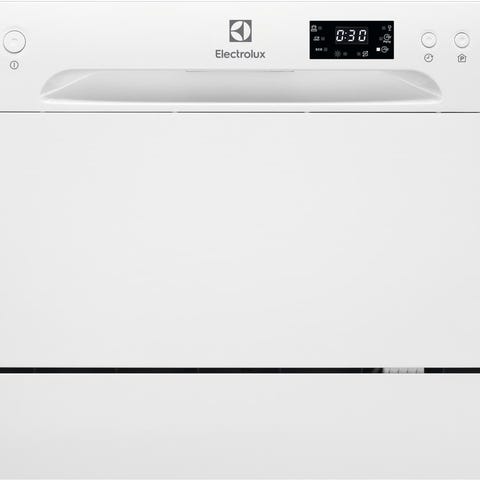 Kompakt oppvaskmaskin beregnet for plassering på benk. Maskinen har frontbetjening med dreiehjul og programknapper, samt indikatorlamper for valgt program. Innvendig er det én kurv for tallerkener, glass og bestikk, med egen bestikkurv og nedfellbare holdere.