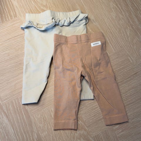 So Cute leggings for jente i størrelse 86. To par enkle leggings med strikk i livet, ett i lys rosa og ett i beige. Egnet som hverdagsplagg eller under kjole og tunika for barn rundt 12–18 måneder, avhengig av barnets høyde og kroppsfasong. Materialet fremstår som mykt og komfortabelt for bruk inne eller under yttertøy.