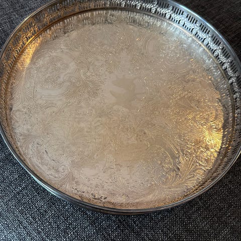 Silverplated stort brett fra -70 tallet. Måler 45 cm × 31 cm. Noen bruksmerker finnes, se bilder.