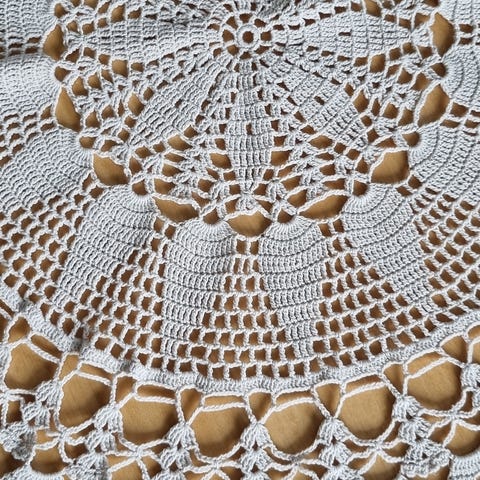 Håndheklet duk i hvitt til rundt bord.