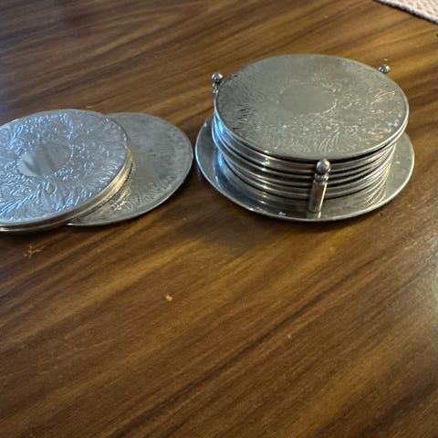 Nydelige glassbrikker/ koppbrikker i sølvplett. Litt forskjellige motiv, men alle like vakre. Disse kan selvfølgelig btukrs til annet også , eks kubbelys et .
