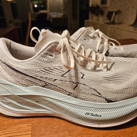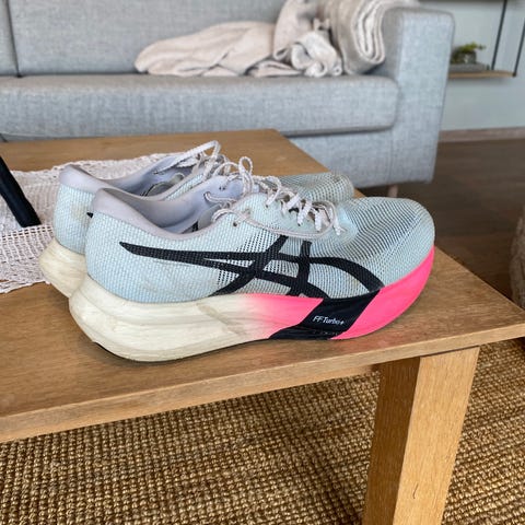 Brukte Asics Superblast 2. Dosse skoene antas å kunne løpes mye mer enn de ca. 500km jeg har brukt de, noen rapporterer om opptil 1000km! Som du ser av bildene behandler jeg mine sko bra også. Kan kjøpes med Vipps og jeg sender med Postnord til 69,- ekstra. Fiks Ferdig gjør det bare dyrere.