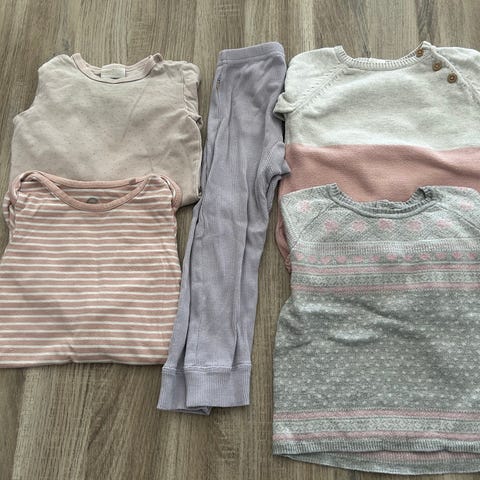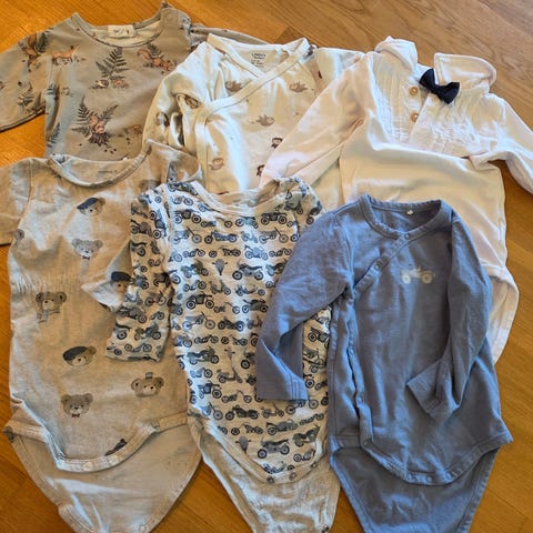 Liten klespakke med bare bodyer, størrelse 92. Noen flekker på noen av plaggene. Se bildene.