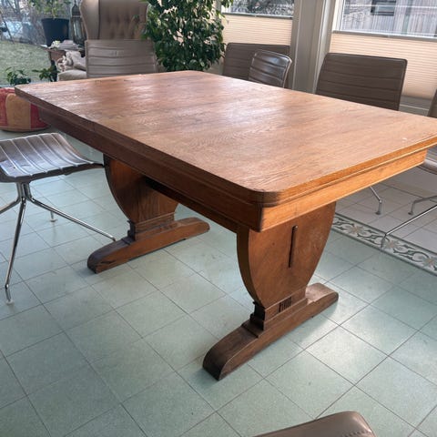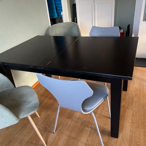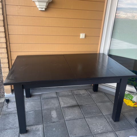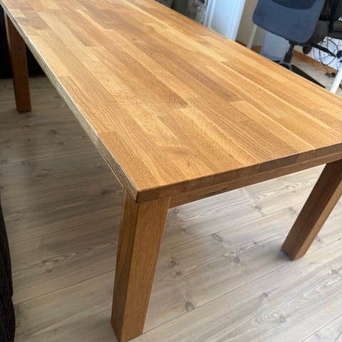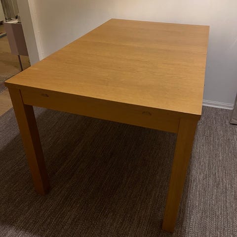 IKEA spisebord i lyst tre. Rektangulær bordplate med rette ben. Bordet har naturlig trestruktur og lys brun overflate. Egnet som spisebord på kjøkken eller i spisestue. Overflaten viser noe bruksslitasje med riper og fargeforskjeller, se bilder for detaljert tilstand. Gis bort mot henting.