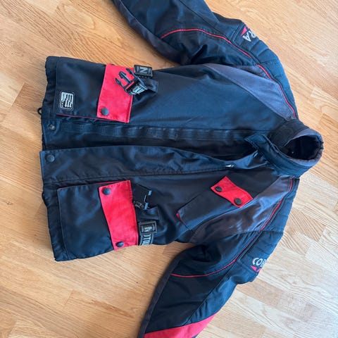 Mizar MP-A3 MC-bekledning består av en tekstil MC-jakke i svart og rødt i størrelse 34 og en svart tekstil MC-bukse i størrelse 140.