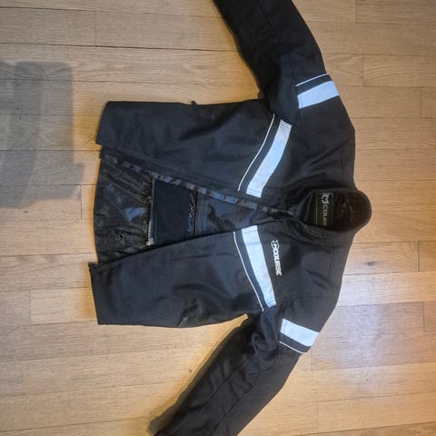 Buksen har glidelås og knapp i livet, samt glidelås nederst på bena. Settets materiale er slitesterk tekstil egnet for motorsykkelbruk.