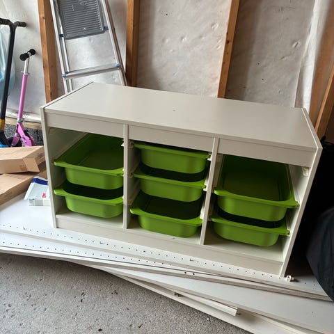 IKEA barnemøbel bokhylle i tre. Laget i lyst treverk med enkel, åpen konstruksjon som gjør det lett for barn å se og hente innholdet selv.