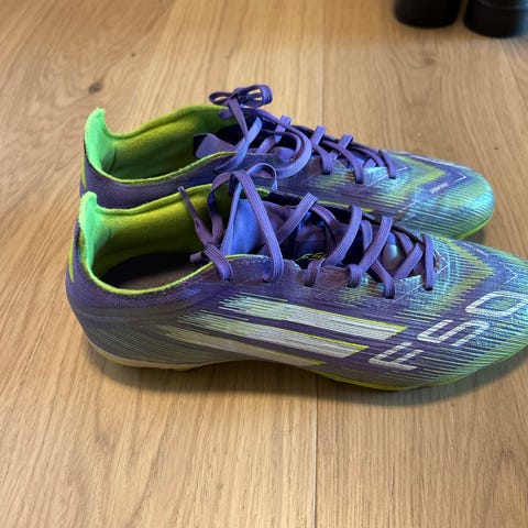 Adidas F50 fotballsko i blå og rosa farge. Skoene har overdel uten lisser og et mønstret design. Leveres ikke sammen med en blå bærepose. pent brukte fotballsko