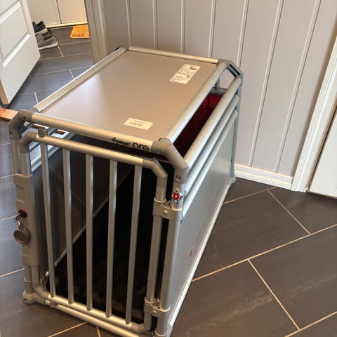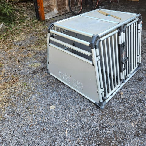 Buret har to separate rom med hver sin dør foran. Nøkler følger med. Rammen er i lys grå metall med gitterdører, og bakplater er i rød plast. Egnet som transportbur til hund i bil eller som fast oppstallingsbur der målene passer. Buret har skrå bakvegg.