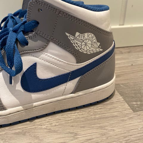 Air Jordan sneakers joggesko i størrelse 43. Modellen er en høy variant med snøring. Skoene har overdel i syntetisk materiale og tekstil i grått og hvitt med mørkeblå detaljer. Selges på grunn av de er for små. Brukt lite ingen skadder bare lit skitne burde være ganske enkelt å vaske.