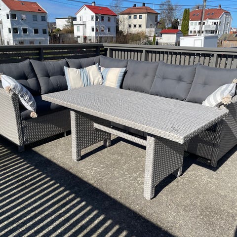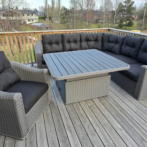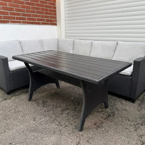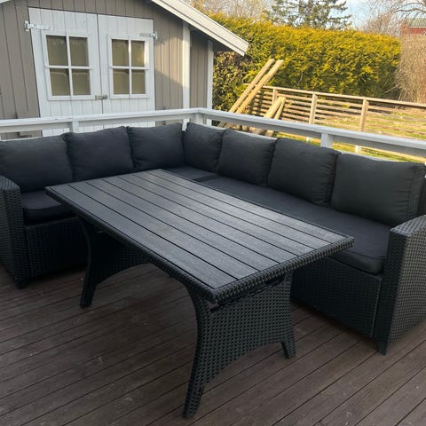 Ukjent merke hjørnesofa utemøbelsett med bord glassplate i svart, fra jula.