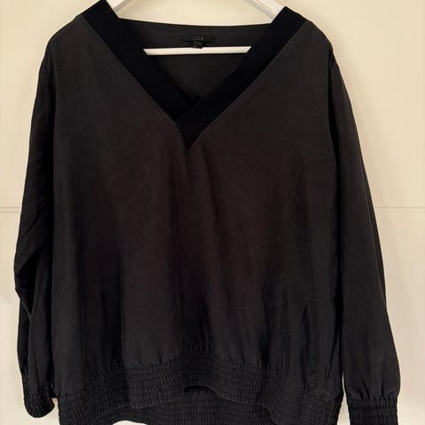 COS bluse for dame i størrelse M. Blusen er grå og laget i silke. Modellen har lange ermer og V-utringning foran. Enkel, ensfarget design som passer til både hverdags- og kontorantrekk.