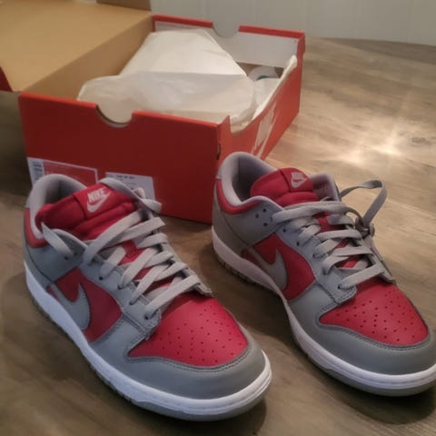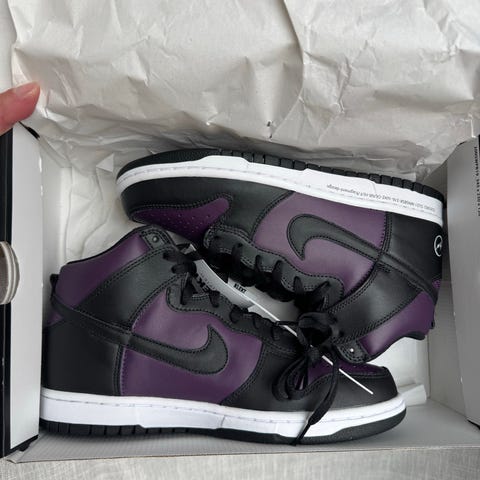 Nike Dunk High joggesko i størrelse 42.5 Modellen er en høy sneakers med snøring. Skoene har overdel i svart og hvit med Nike-logo på sidene. Perforert tåparti for ventilasjon og polstret krage for komfort rundt ankelen. Yttersåle i gummi med mønster for grep. Passer som fritidssko og hverdagsbruk.