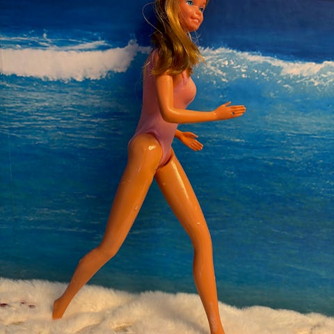 Barbie dukken åpner øynene ved at du løfter høyre arm.