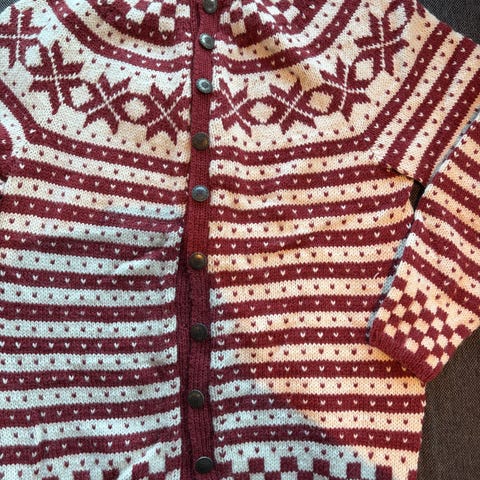 Helt ny hjemmestrikket ulljakke i fint mønster, mørk rød/ hvit .Kjøpt i Tallin. Fint arbeid, like fin på vrangen som på retten . Hel lengde. 66 cm, armlengde fra skulder 57cm og bredde nede på jakken ca 56cm.