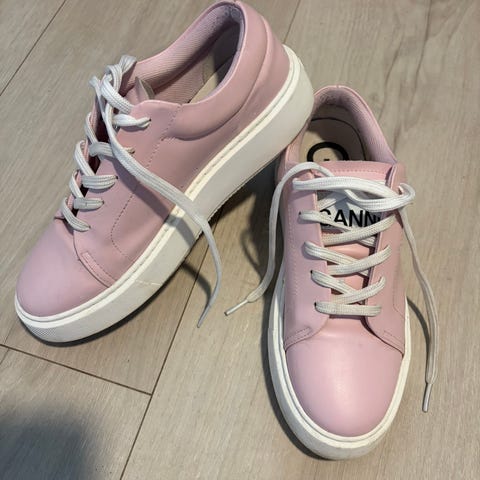 Ganni sneakers joggesko i størrelse 39. Modellen har snøring foran og dekorative detaljer langs åpningen. Sålen er flat med lett forhøyet hæl for stabilitet. Passer til hverdagsbruk og fritid. Mørk denim farge. Materiale fremgår av bildene.