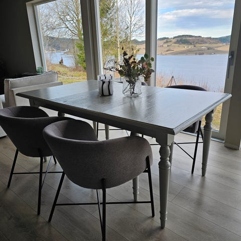 Pent brukt spisebord som er helt og pent fra IKEA med 3 spisestoler fra JYSK som også er i god stand. Kan følge med en fjerde stol som har en skade i ryggen, men som ikke er synlig kosmetisk og som fortsatt kan brukes.