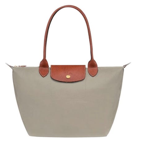 Longchamp Pliage i farge beige med brunt skinn for dame. Vesken er laget i stoffmateriale med kontrastdetaljer og doble hanker i brunt skinn. Egner seg til hverdagsbruk og kan bæres i hånden eller over skulderen. Modellen kan brettes sammen for kompakt oppbevaring når den ikke er i bruk.