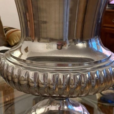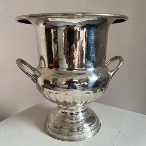 Krukken er laget i metall med dekorert kant og fot, og kan brukes som urne, plantepotte eller til annen innendørs dekorasjon. Denne er stor 🌺nypris kr 2990