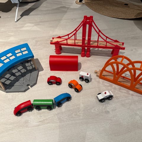 Fin tregarasje med trebiler. Noen små hakk, ellers fin som ny
