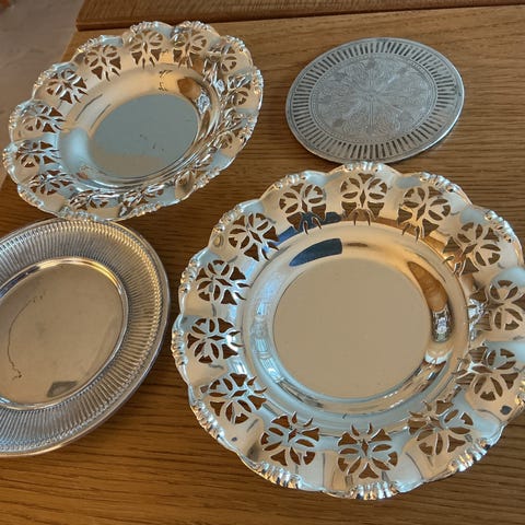 Diverse sølvplett, eks ha varme kjeler eller fat på til gjester, eller kan brukes til mye annet også. Nydelige. Selges samlet 350