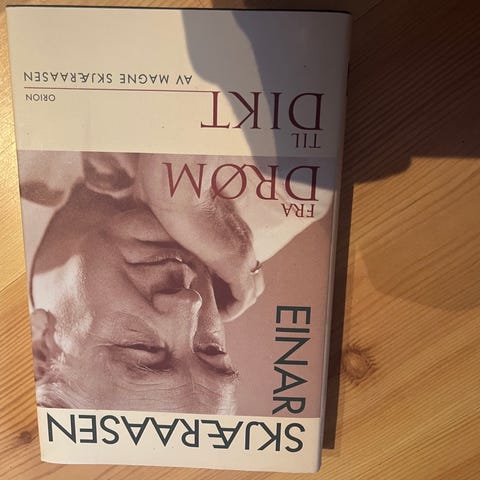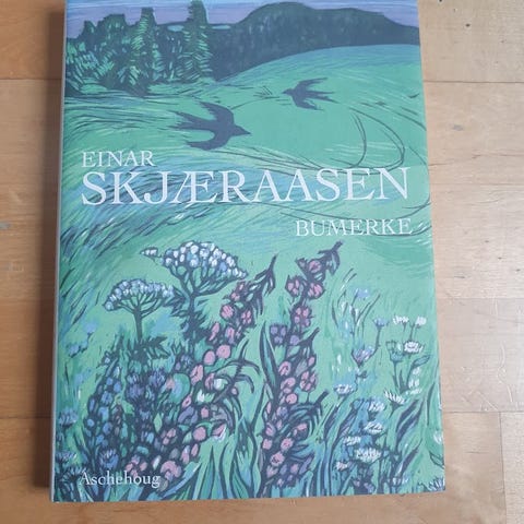 Einar Skjæraasen «Bumerke» bok. Norsk diktsamling med illustrert omslag og innhold. Innbundet utgave med tekster på norsk og fargeillustrasjoner som viser landskap og naturmotiv.