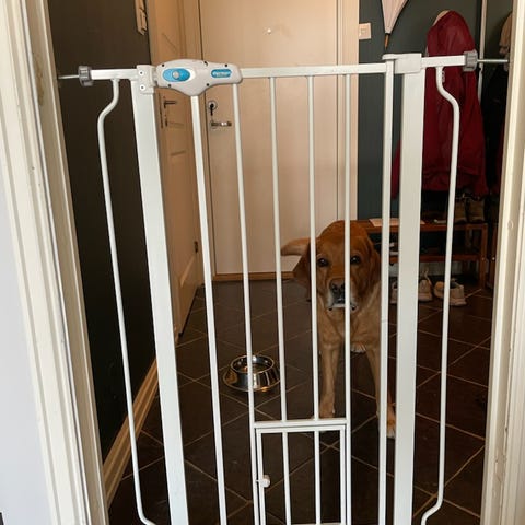 Solid og praktisk grind som passer godt til både valper og mellomstore til store hunder. Den ekstra høyden gjør den spesielt egnet for hunder som hopper høyt eller trenger tydelig avgrensning i hjemmet.