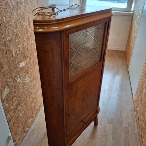 100 år gammelt Vitrineskap i tre med glassdør og glasshyller. Høyde 145 cm bredde 89 cm og dybde er 42 cm Skapet har flere hyller som egner seg til oppbevaring og utstilling av servise, pyntegjenstander eller samlerobjekter. Fronten har innfelt panel nederst, og skapet står på ben. Passer i stue, spisestue eller gang der det er behov for både oppbevaring og innsyn til innholdet. Skapet er fra et dødsbo. Bud ønskes