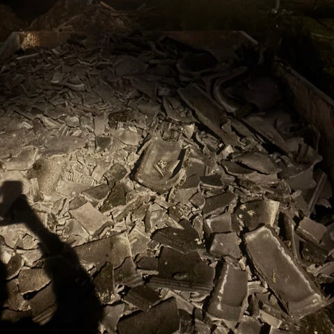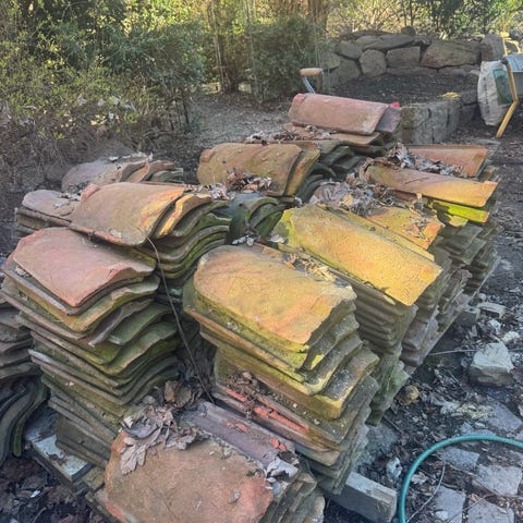 Takstein gis bort mot henting. Kan parkere henger like ved.