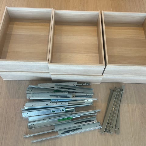 Dører til PAX-skap fra IKEA. 4 dører på 229cm, den ene er malt gul og de tre andre er orginalfargen i hvit/bomull. 4 skuffer med front og dør med glass. Alt selges for totalt 500kr. Skapstammene selges ikke. Noen merker i malingen, se bilde 2.