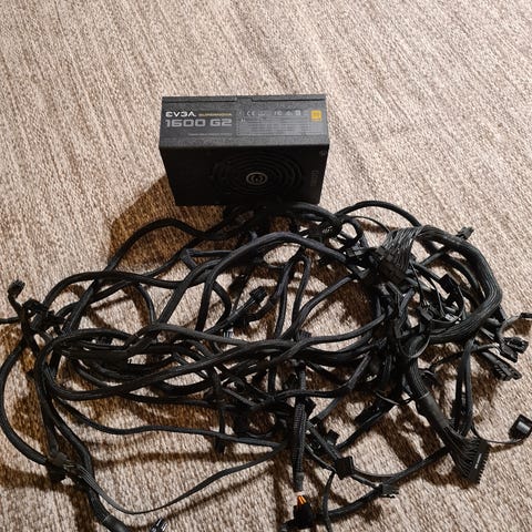 EVGA SuperNOVA 1300 G2 strømforsyning til stasjonær PC. Meget lite brukt, fremstår som ny, med komplette kabler og originalemballasje. Svært robust og høykvalitets PSU fra EVGA som er ment for å drive kraftige PC-er i mange år. Disse er ikke mulig å få tak på nye lenger.