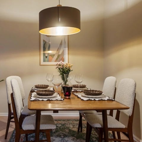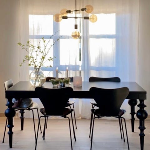 Både bord og stoler er kjøpt brukt, bord er fra Arken og stolene ble kjøpt på second hand.