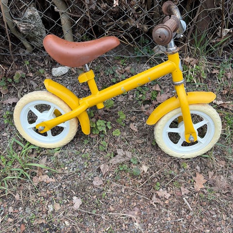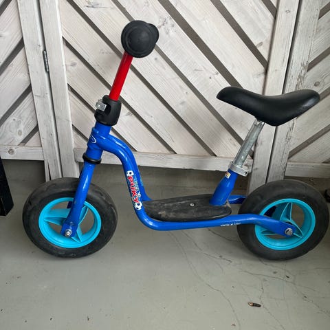 Puky løpesykkel med 10" hjul i rød og gul farge. Sykkelen har lav innstigning, polstret styre og justerbart sete. Egnet for små barn som skal øve balanse og koordinasjon før overgang til tråsykkel.