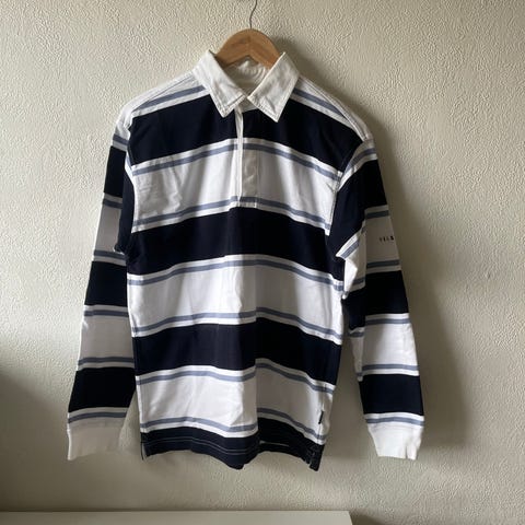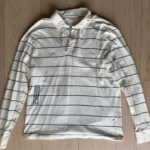 Morris langermet pique-genser for herre i størrelse M. Genseren er hvit med horisontale striper og har krage og knappestolpe i halsen. Laget i bomull, med ribbekanter ved ermer og nederkant. Passer til hverdagsbruk og fritid.