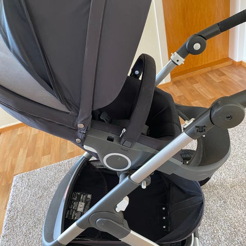 Stokke barnevogn i svart farge. Vognen har fire hjul, justerbart sete og fempunktssele. Frontbøyle og varekurv under setet er inkludert. Trilleenheten kan tas av understellet for enklere oppbevaring og transport. Passer til hverdagsbruk og trilleturer på jevnt underlag.