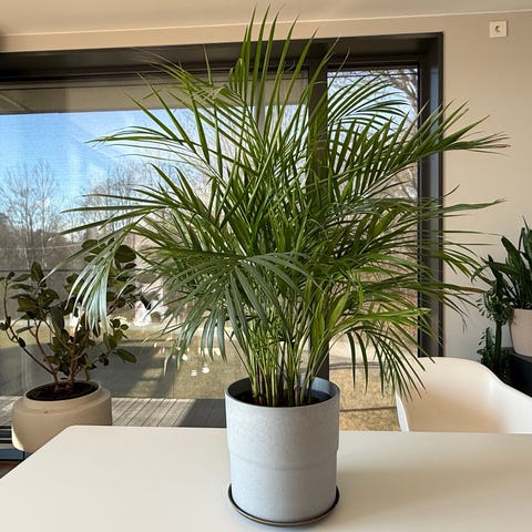 • Grønn potteplante av palmetype for innendørs bruk. Planten står i en rund potte og passer som grønn dekor i stue, gang eller andre oppholdsrom. Krever jevnlig vanning og trives best på et lyst sted uten direkte, sterk sol.