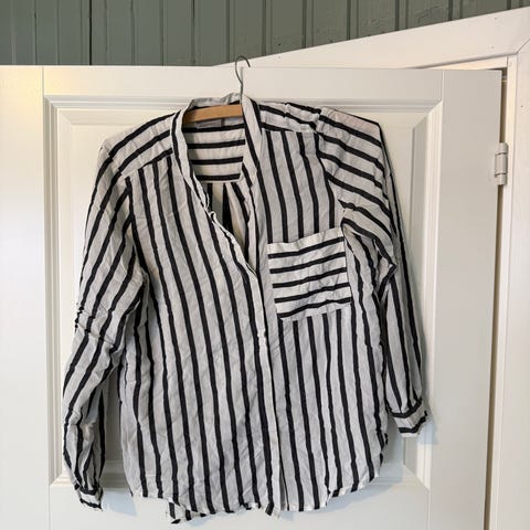 Isabel Marant bluse for dame i størrelse M/38. Passer imidlertid også fint til størrelse S. Svart og hvit med vertikale striper og lange ermer. Lett mykt viskose stoff. Modellen har knappelukking foran og avrundet nederkant. Passer til både hverdagsbruk og mer formelle anledninger, og kan kombineres med bukser, skjørt eller jeans.