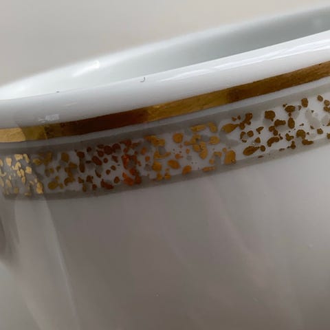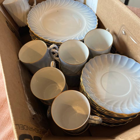 Porsgrund espresso kopper med asjetter i hvitt porselen. Settet består av lave kopper med hank og tilhørende runde asjetter. Klassisk, ensfarget design som passer til servering av din espresso, tar seg meget pent ut på din kaffestasjon, med sitt stilige design. Kan stables. Stempel med Porsgrund under kopp og asjett. Disse har ikke blitt brukt her, og har derfor liten slitasje og ingen bruksmerker.