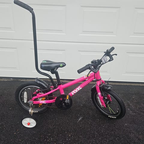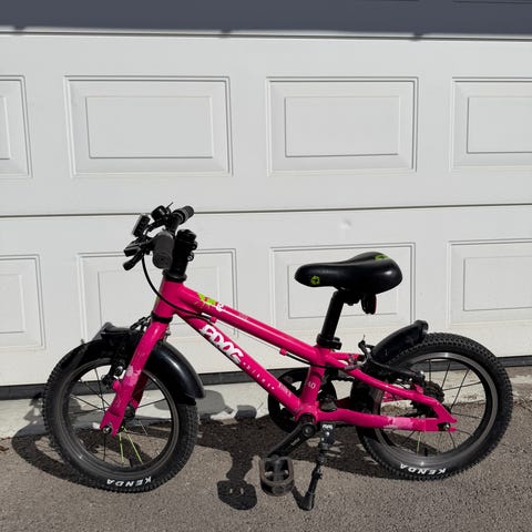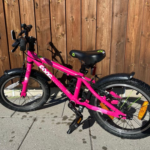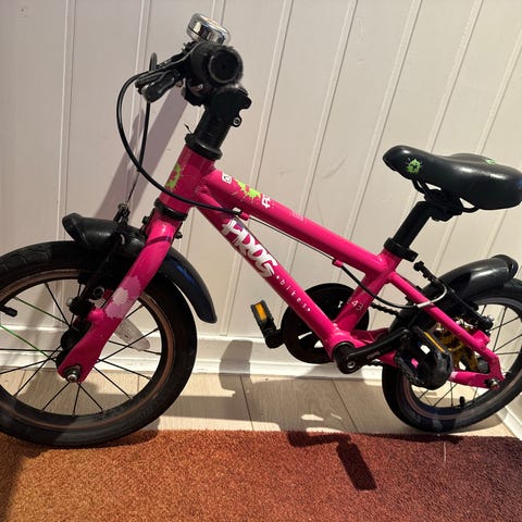 1 år gammel Frog 40 barnesykkel med 14" hjul i rosa farge. Sykkelen har lett ramme tilpasset barn, rette styre med håndbremser foran og bak, samt skjermer. Sete og styre kan justeres i høyden for å passe barn i aktuell størrelse. Passer for 3 år +. Må hentes.