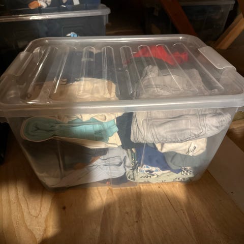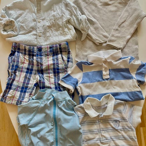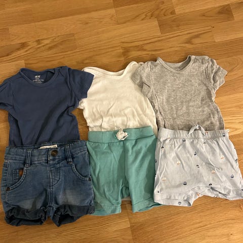 Liten pakke med klær til sommeren. 3 shorts, en T-skjorte og 1 kortermet skjorte. Som vist et lite hull på den lyse shortsen, ellers pent brukt, men flekker kan forekomme.