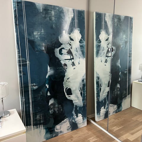 Orginalt maleri av Camilla Solli Amdal. Hengt i stuen i noen år og nå stått i garasjen i et års tid. Lite begynnende sprekker et sted men dette syns ikke.