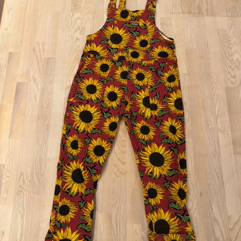 Veldig kul oversized snekkerbukse i burgunder med dinosaurer på! Orginalt var den grå, men farga den.