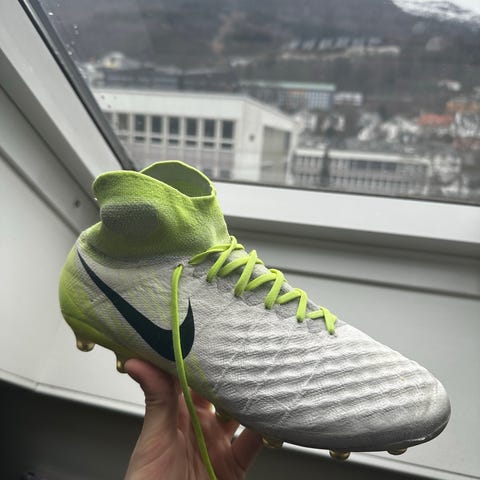 Nike Magista fotballsko i hvit og neongul farge. Modellen har høy ankelkrage for ekstra støtte, brukt få ganger, størrelse 38, selges rimelig.